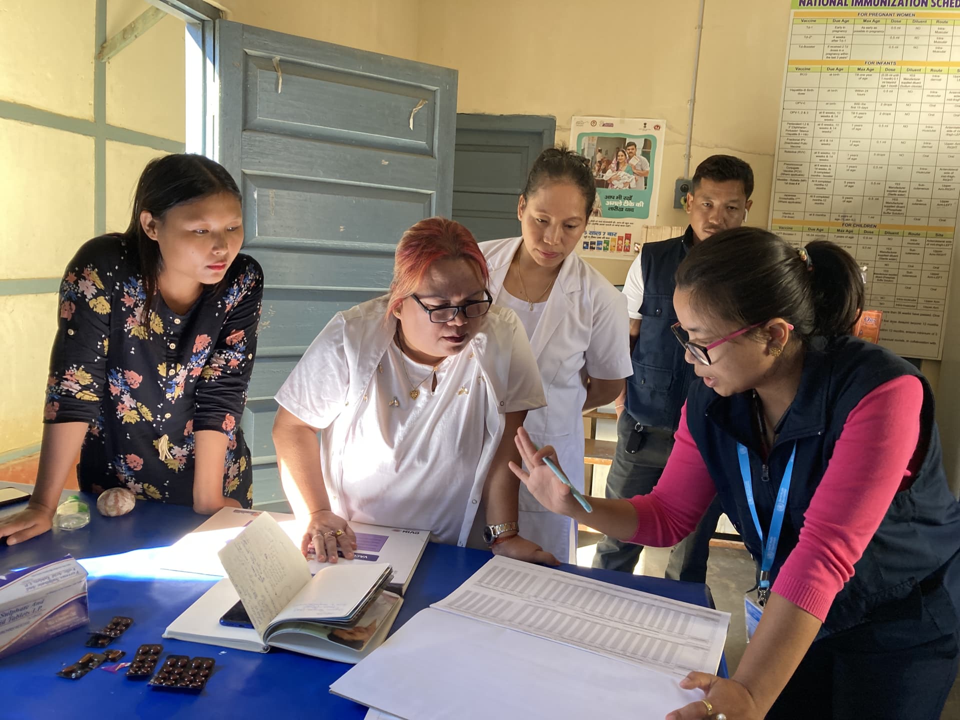 A man, wearing a face mask, reviews a list of data that he is holding in his hands.