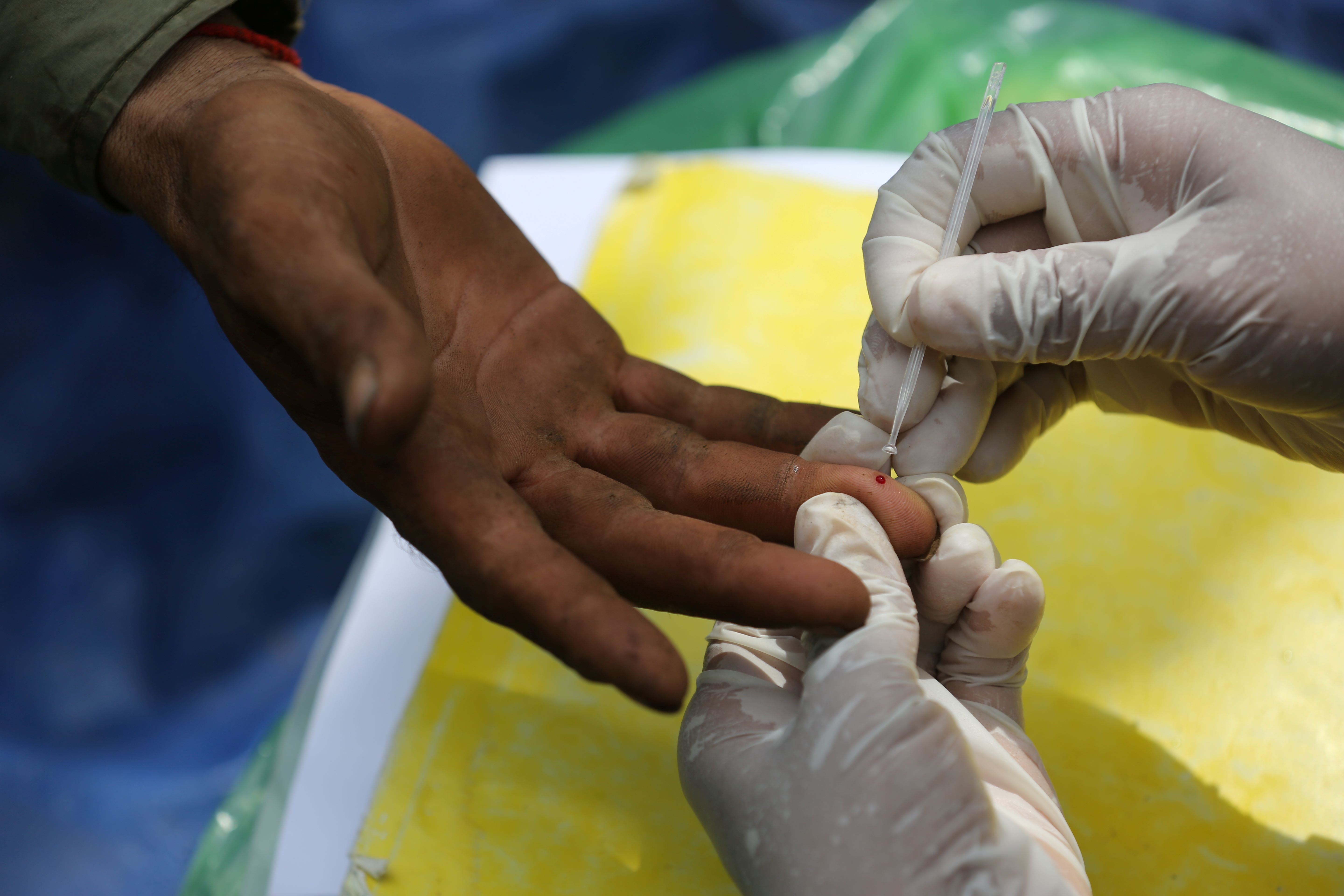 A mobile malaria worker conducts a blood test to check for the presence of malaria parasites in a patient from Kampong Speu, Cambodia.