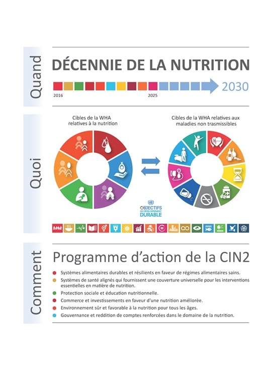 Ce travail est encadré par le Plan d’application exhaustif concernant la nutrition chez la mère, le nourrisson et le jeune enfant, adopté par les États Membres en vertu d’une résolution de l’Assemblée mondiale de la Santé en 2012. Les mesures visant à mettre fin à la malnutrition sont également essentielles pour atteindre les objectifs liés à l’alimentation énoncés dans le Plan d’action mondial pour la lutte contre les maladies non transmissibles 2013-2020, dans la Stratégie mondiale pour la santé de la femme, de l’enfant et de l’adolescent (2016-2030), dans le rapport de la Commission pour mettre fin à l’obésité de l’enfant (2016) et dans le Programme de développement durable à l’horizon 2030.