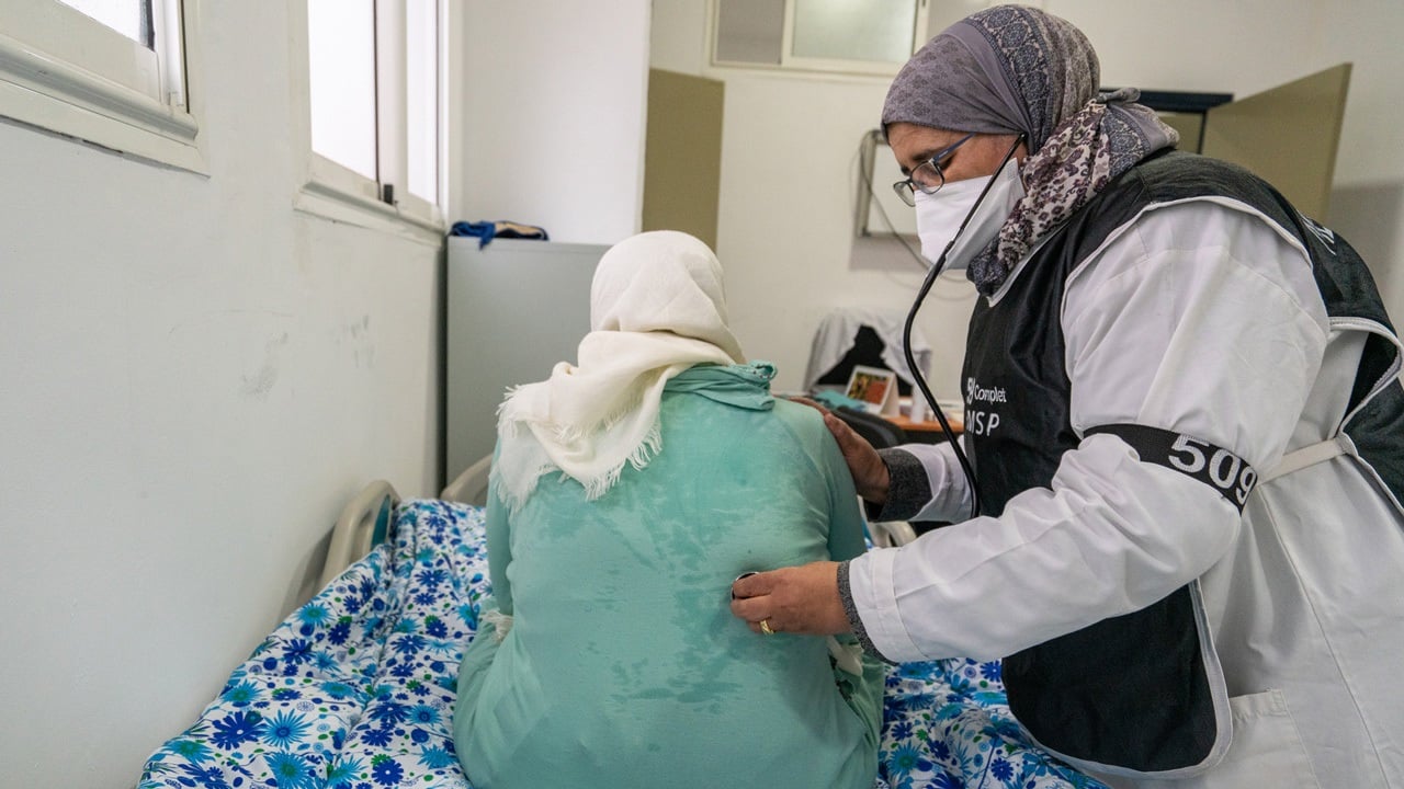 A woman receiving palliative care in a health center. Country: Morocco.