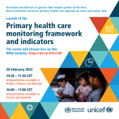 WHO and UNICEF are jointly releasing the landmark Primary health care monitoring framework and indicators monitoring health systems through a primary health care lens, the first-ever globally normative and endorsed primary health care measurement and monitoring framework, and the official measurement framework in support of the Declaration of Astana and Operational Framework for PHC. As countries strive to reorient their health systems around the principles of primary health care, this Framework responds to Member States’ request to monitor primary health care performance to accelerate progress towards universal health coverage and the other health-related Sustainable Development Goals.