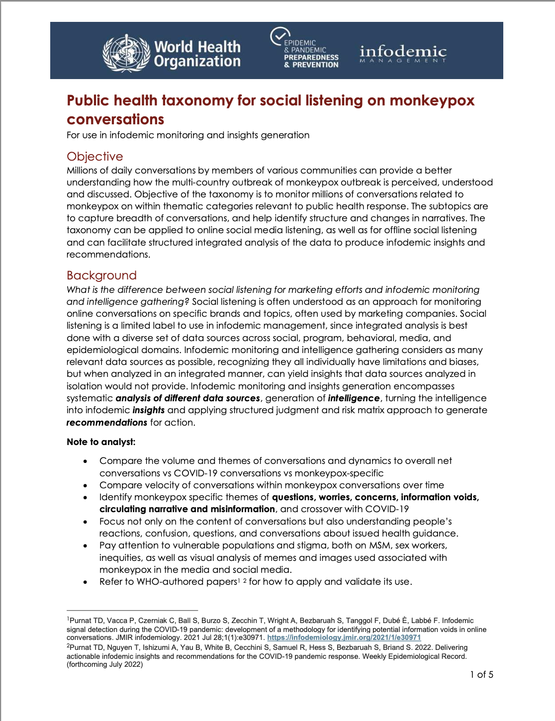 The World Health Organization (WHO) has developed a public health taxonomy to support infodemic monitoring and insights generation of monkeypox conversations. The technical document provides an overview of how social listening can be applied to monkeypox conversations which can be used to generate infodemic insights for public health response. Taxonomies are used to better organize and frame analytics, especially when integrating data sources of varying types and quality.