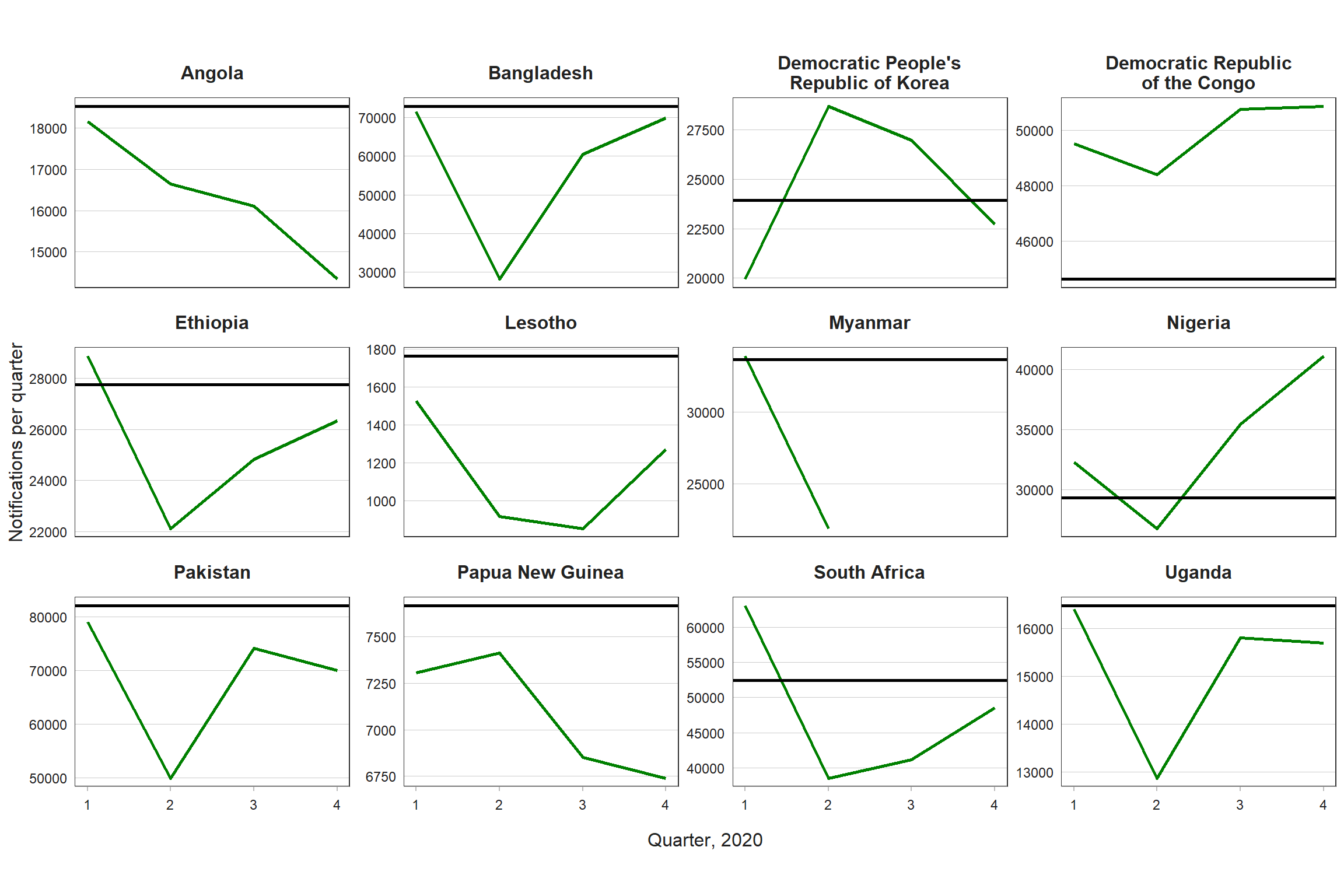 A widely available indicator that can be used to assess the impact of disruptions caused by the COVID-19 pandemic on essential TB services at country level is the national number of monthly or quarterly notifications of people diagnosed with TB. This indicator reflects impacts on access to diagnosis and treatment on both the supply side (e.g. capacity to continue to provide services) and the demand side (e.g. willingness and ability to seek care in the context of lockdowns and associated restrictions on movement, concerns about the risks of going to health care facilities during a pandemic, and stigma associated with similarities in symptoms related to TB and COVID-19). After successfully collecting such data from 14 high TB burden countries for January–June 2020 (1), in January 2021 WHO established a global system for regular collection of monthly and quarterly notification data from more than 100 countries, initially for the whole of 2020 and then for 2021, with visualizations of all reported data available in real time (2–4).
