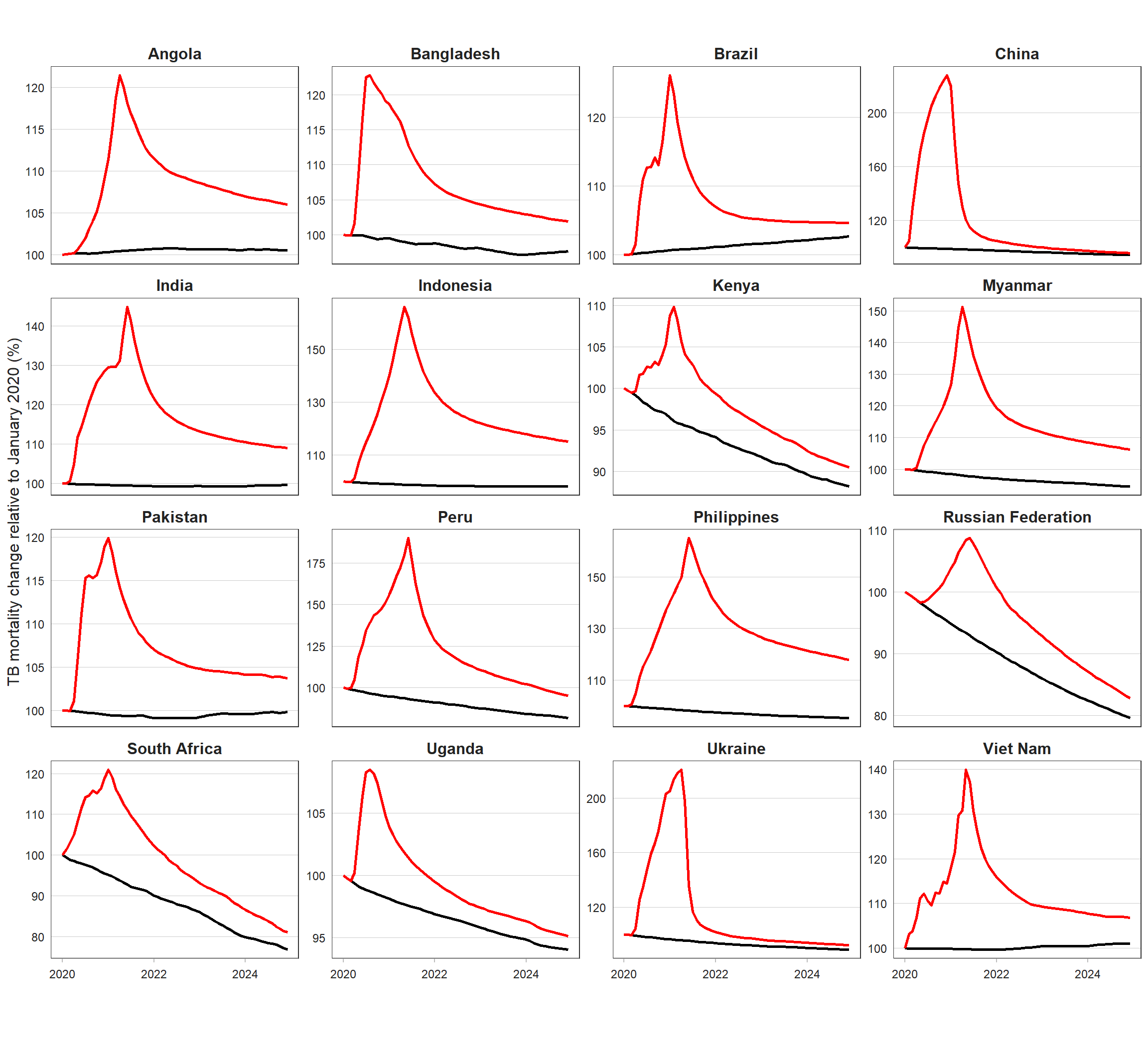 Standardized TB mortality rate (including HIV)a. The black line indicates the baseline assuming no COVID-19 disruptions, and the red line is the modelled impact.