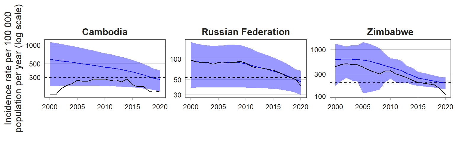 TB incidence rates are shown in blue. The black solid lines show notifications of new and relapse cases for comparison with estimates of the total incidence rate. Shaded areas represent uncertainty intervals. The horizontal dashed line shows the 2020 milestone of the End TB Strategy.