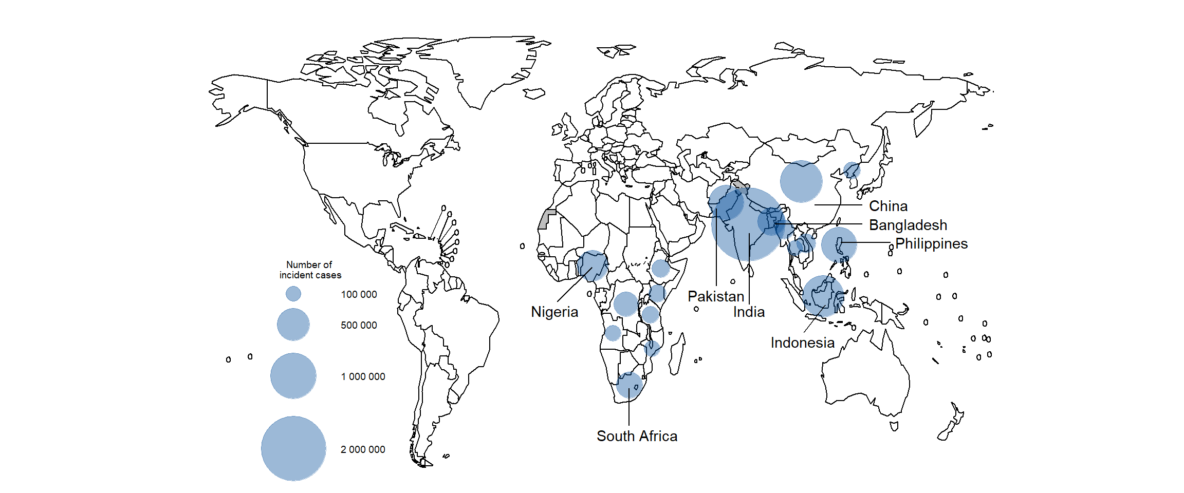 Geographically, in 2020, most TB cases were in the WHO regions of South-East Asia (43%), Africa (25%) and the Western Pacific (18%), with smaller shares in the Eastern Mediterranean (8.3%), the Americas (3.0%) and Europe (2.3%). The 30 high TB burden countries (shown in Fig. 2.1.3a) accounted for 86% of all estimated incident cases worldwide, and eight of these countries (Fig. 2.1.4) accounted for two thirds of the global total: India (26%), China (8.5%), Indonesia (8.4%), the Philippines (6.0%), Pakistan (5.8%), Nigeria (4.6%), Bangladesh (3.6%) and South Africa (3.3%).