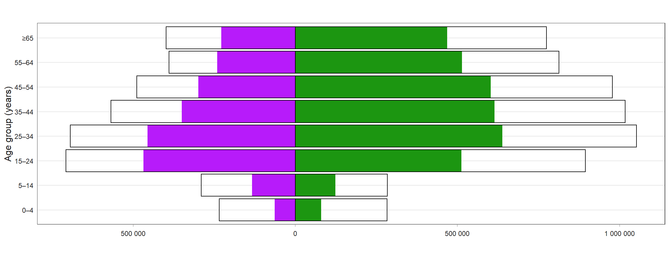 Fig. 2.1.7a Global estimates of TB incidence (black outline) and case notifications of people newly diagnosed with TB disaggregated by age and sex (female in purple; male in green), 2020