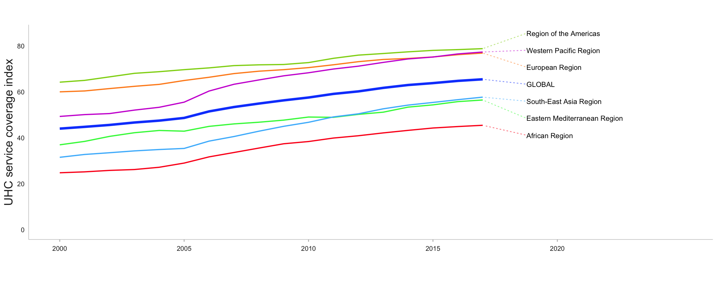 Fig. 6.1.1 Trends in the UHC service coverage index in WHO regions and World Bank income groups, 2000–2017