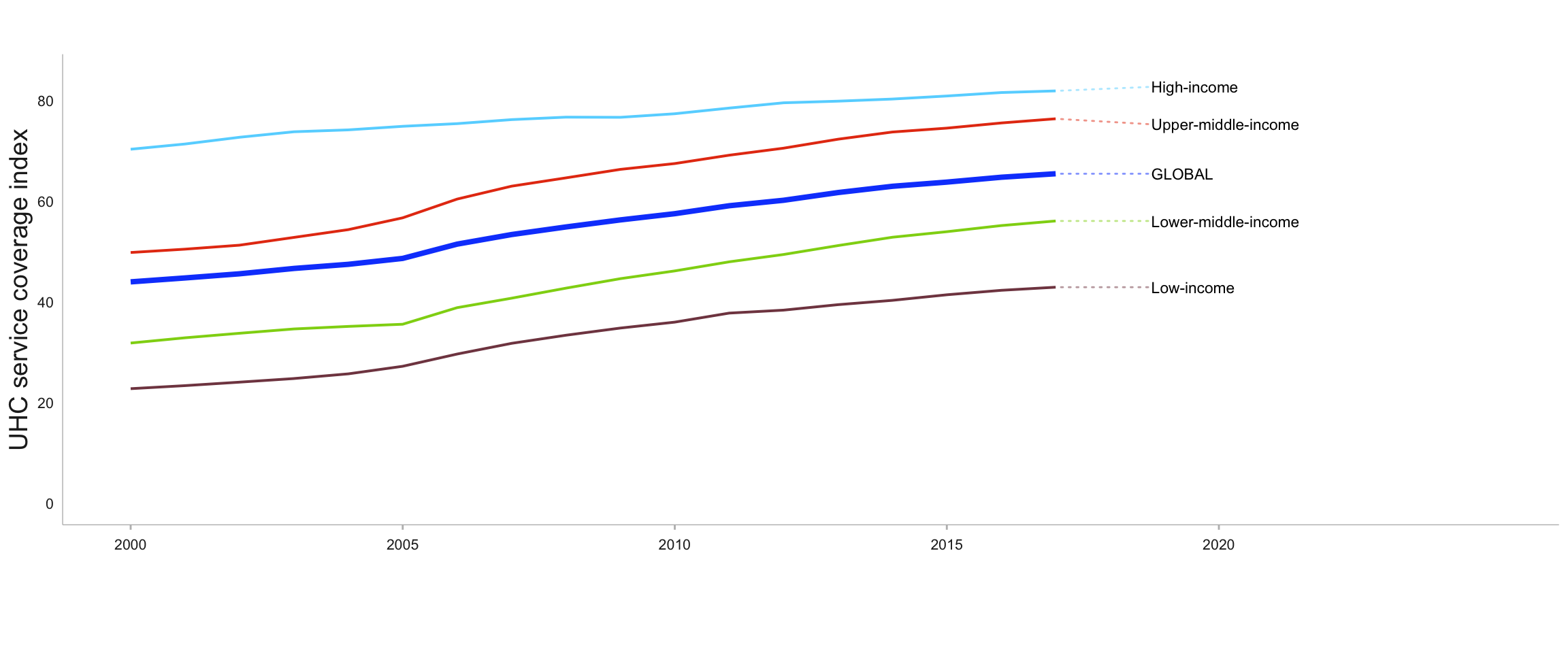 Although data post-2017 are not yet available, the COVID-19 pandemic is likely to have caused progress towards UHC to stall or reverse in 2020 and 2021 in many countries.