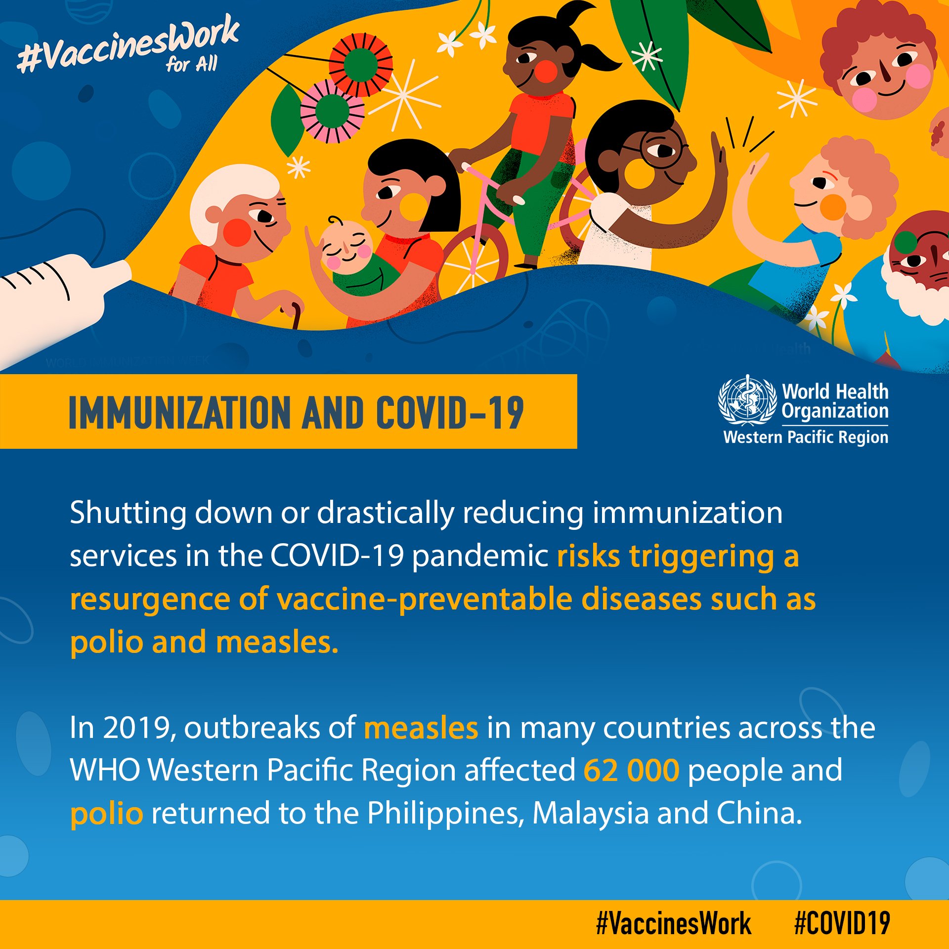 - During COVID-19 pandemic, immunization services should be maintained to prevent vaccine-preventable diseases (such as measles and polio) if safety of health care workers and communities can be ensured.